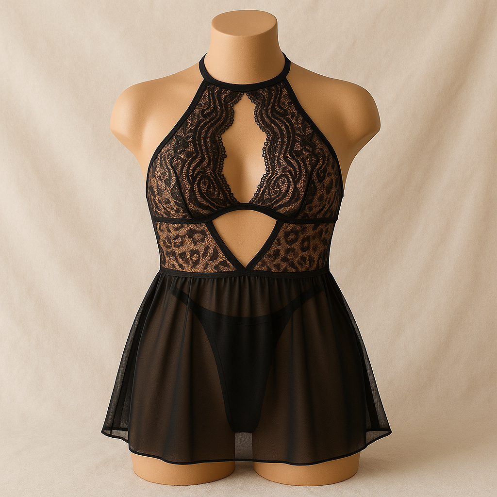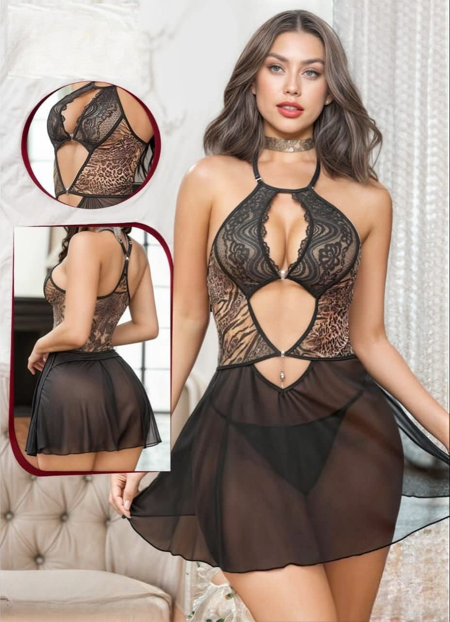 أطلقي جانبك الجريء مع طقم اللانجري المميز بتصميم هالتر وطبعة ليوبارد جذابة.