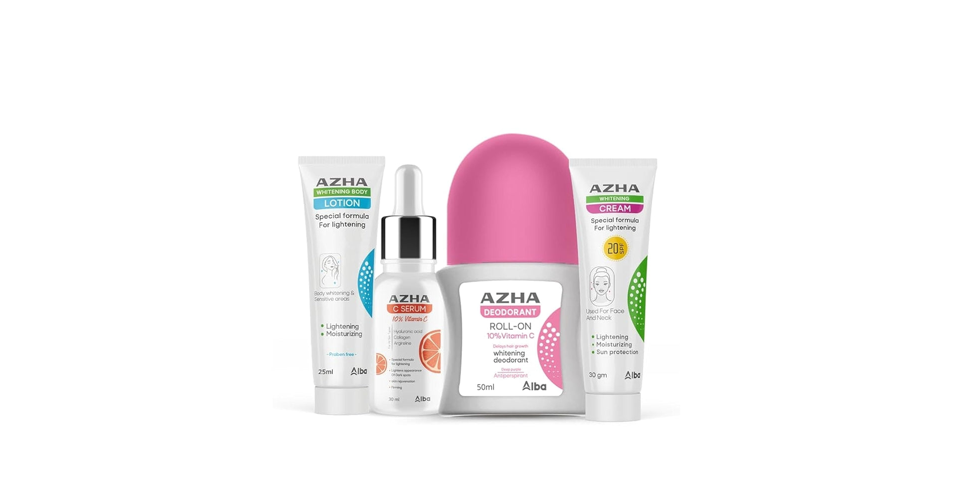 Azha Whitening، Azha Vitamin C، أزها لتفتيح البشرة، Azha Roll On، Azha Cream، Azha Serum، مجموعة أزها، تفتيح الجسم والوجه، عناية بالبشرة الحساسة، منتجات أزها الأصلية.