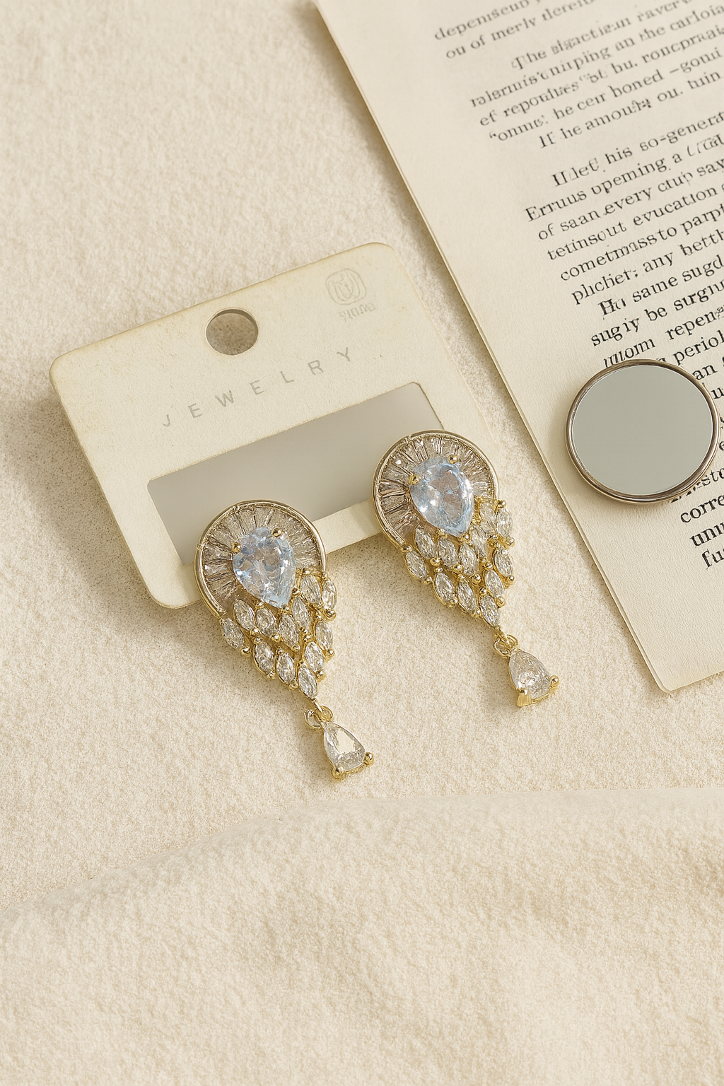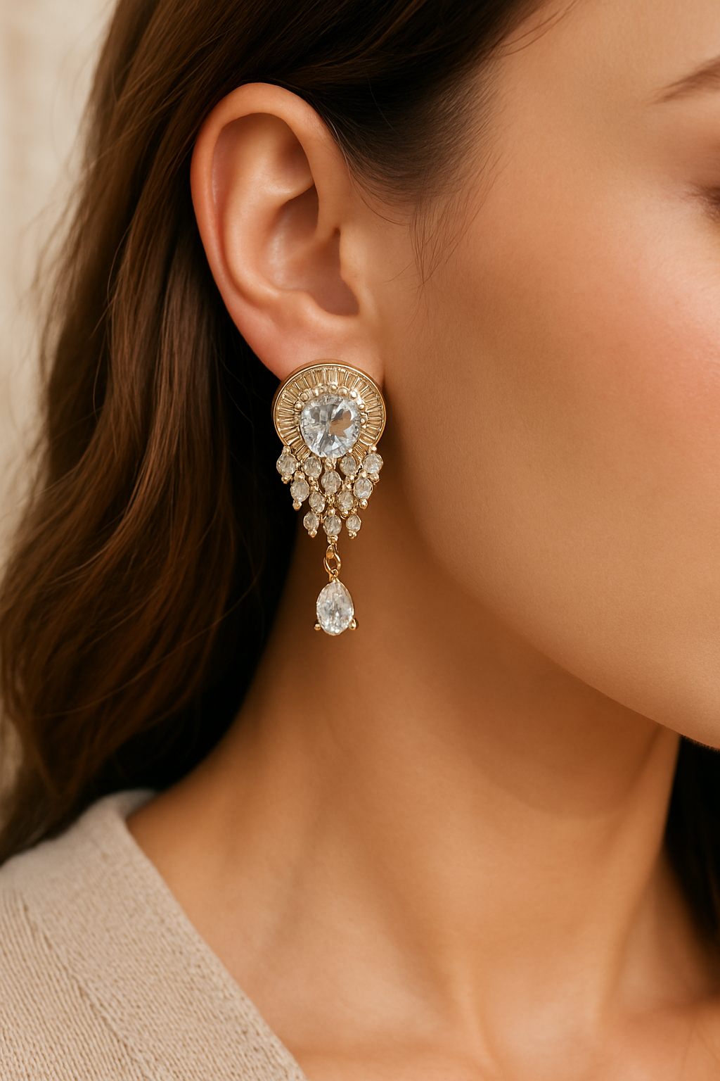 حلق كريستال ذهبي أنيق – إكسسوار فخم لإطلالة السهرات والمناسبات
